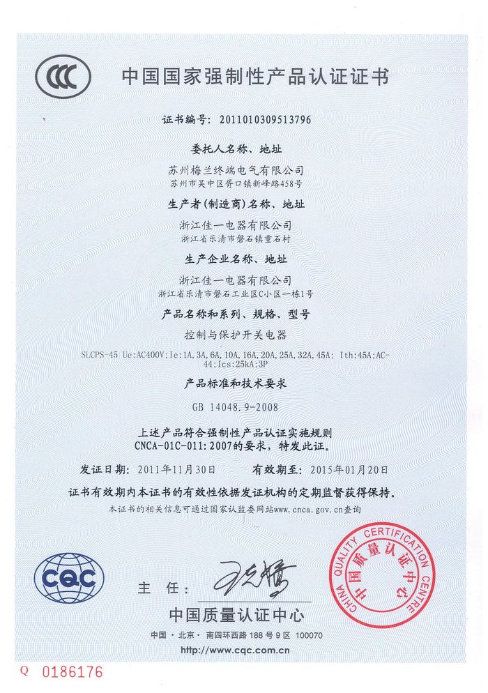 SLCPS-45控制與保護開關(guān)資質(zhì)證書