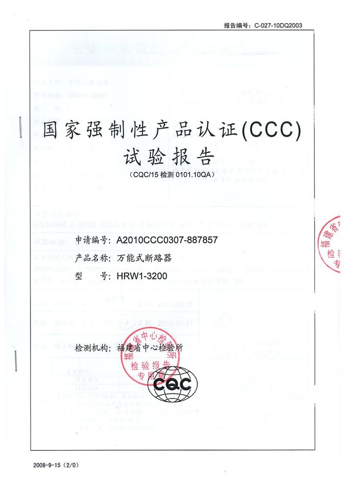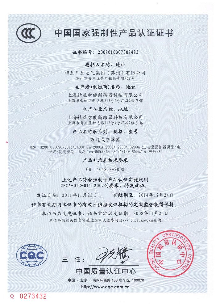 MRW1-3200萬能斷路器資質證書