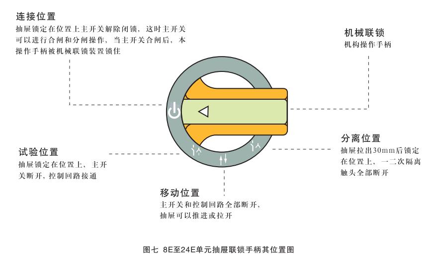 小手柄的操作及其位置定義與8E/4, 8E/2單元操作于柄基本相同,唯一沒有“斷開位置”而代之以“連接位置(↓)。只有當(dāng)手柄處于此位置時,才可操作主開關(guān)操作手柄(大手柄)。大手柄指示箭頭橫向左側(cè)時為“分?jǐn)辔恢?rsquo;,此時一次和二次電路處于無電狀態(tài),大手柄順時針轉(zhuǎn)動到指示箭頭向上時為“合閘位置”,主開關(guān)合閘。小手柄和大手柄的操作有嚴(yán)格的機(jī)械聯(lián)鎖,不能隨意操作,更不能硬扳死撬。注意:只有小手柄處在“連接位置”時,大手柄才能進(jìn)行合閘操作;同時只有大手柄處在“分?jǐn)辔恢?,時,小于柄方能轉(zhuǎn)動。有時大手柄雖也處在“分?jǐn)辔恢?rsquo;但定位不準(zhǔn),這會造成小手柄不能轉(zhuǎn)動或轉(zhuǎn)動不到位,此時千萬不可硬扳,應(yīng)再稍轉(zhuǎn)動大手柄使之準(zhǔn)確到位即可。