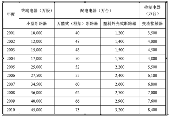 根據(jù)中國電器工業(yè)協(xié)會(huì)的統(tǒng)計(jì),2001 年至2010 年主要低壓電器產(chǎn)品的產(chǎn)銷量呈逐年上升趨勢,低壓電器產(chǎn)品保持較快速度增長,終端電器、配電電器、控制電器產(chǎn)量復(fù)合增長率分別為18.19%、11.39%、10.22%,今后較長一段時(shí)間內(nèi)我國低壓電器市場容量仍會(huì)穩(wěn)步增長。