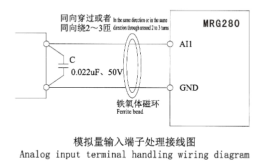 在某些模擬信號受到嚴(yán)重干擾的場合,模擬信號源側(cè)需加濾波電器或鐵氧體磁芯,如下圖