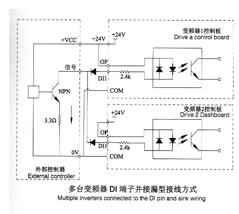 注意:此種接線方式,下同變頻器的Dl端子不能并接使用,否則可能引起Dl的誤動作;若需Dl端子并接(不同變頻器之間),則需在Dl端子處串接二吸管(陽極接Dl)使用,二極管需滿足;IF>lOmA、UF<1V,如下圖。